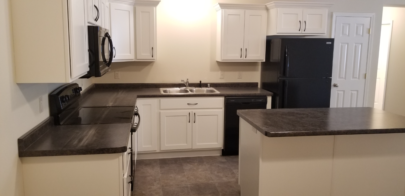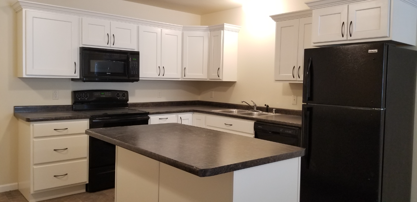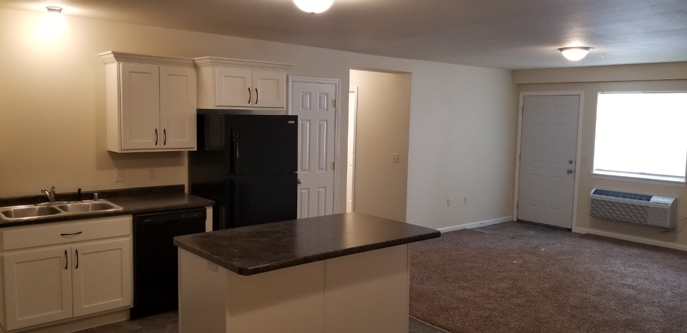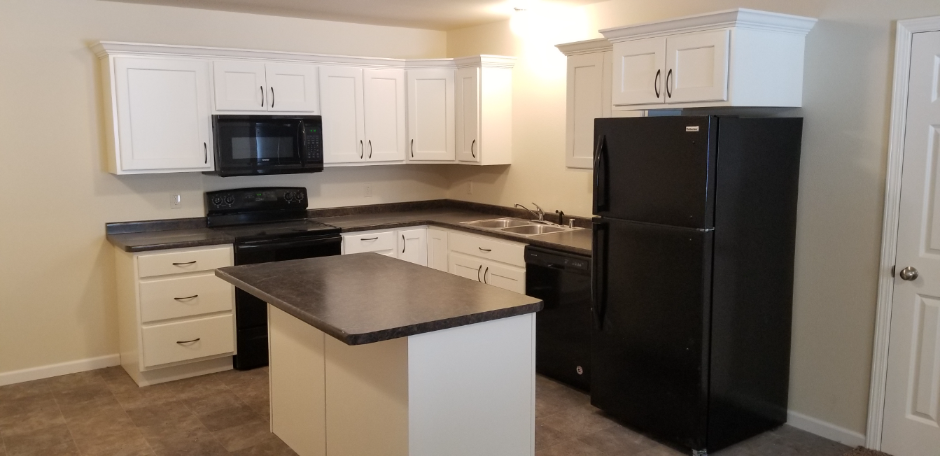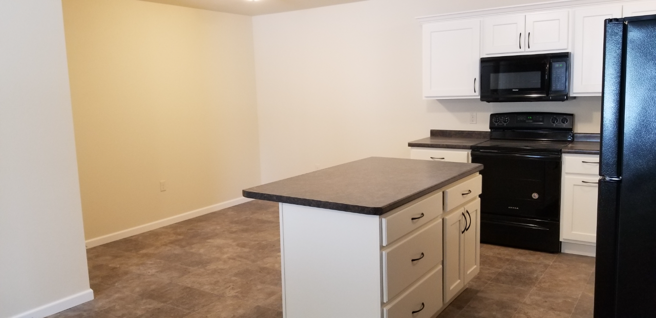 Each apartment features an open-concept kitchen/dining/living room area that feels spacious. The kitchen offers modern white cabinets complete with crown molding that gives them an added level of class. In addition to the stove, fridge & microwave, there is a dishwasher and an island.