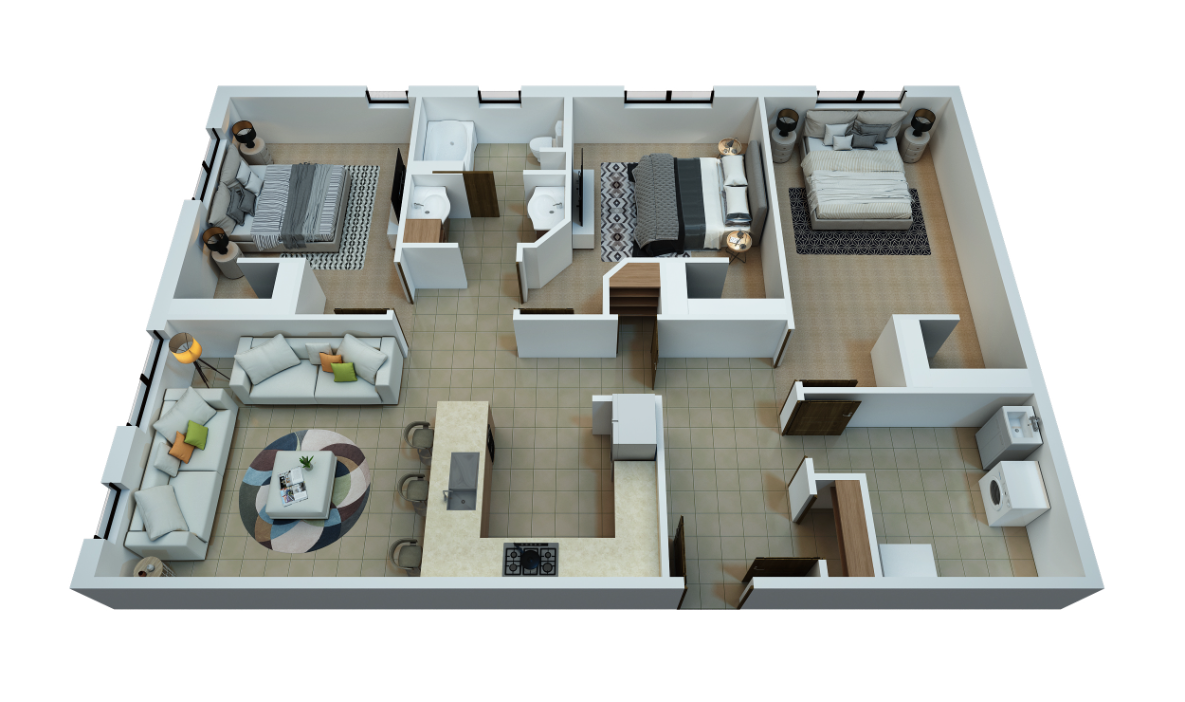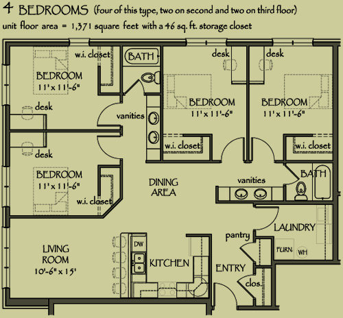 CLOSE TO CAMPUS: This 4 bedroom apartment is spacious 1371+ square feet. The apartment offers an open-concept kitchen, two full bathrooms, four individual sinks and vanities, and soundproofing walls to provide less outside noise when you need to study.