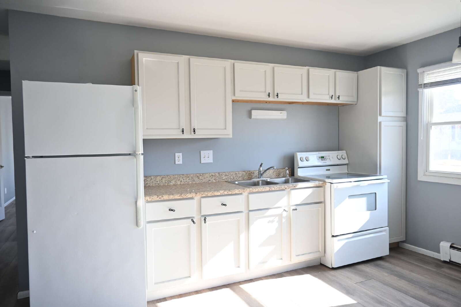 Rent includes heat and water. Tenant pays remainder of utilities. Landlord handles lawn care and snow removal.