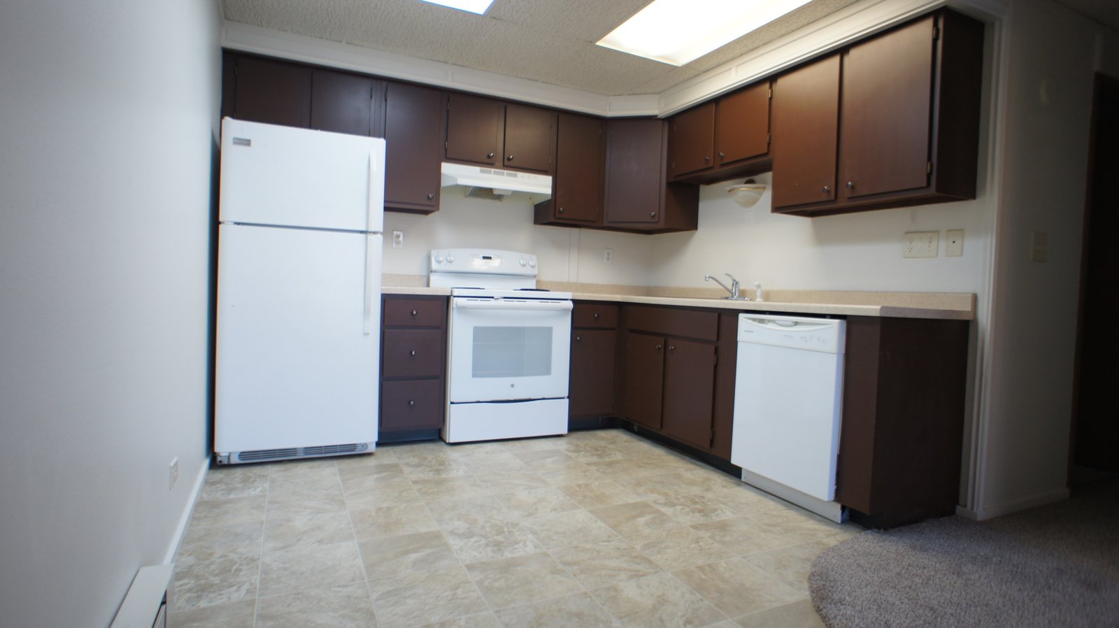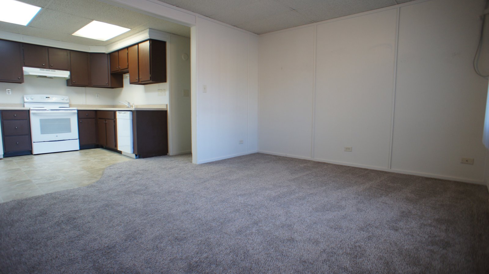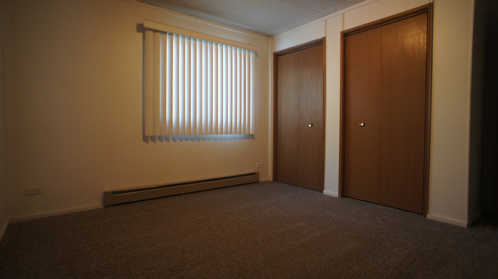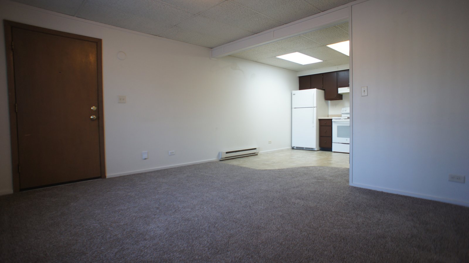 This two bedroom apartment has a roomy open design that flows from room to room. The kitchen includes stove, refrigerator, and in most units a dishwasher. Every apartment comes equipped with an in-wall air conditioner for cooling off on those warm summer nights. On-site there are coin-op washers and dryers to make doing laundry more convenient, and a private storage space in the basement.